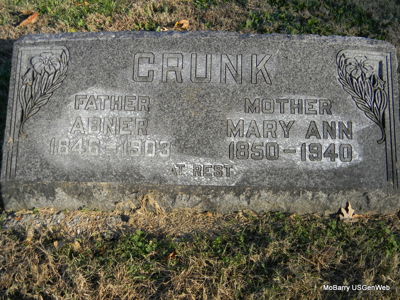 SSW: Mary Ann - Inscription: "Father" - Research Note: 1880 Census, McDonald, Jasper, Missouri Abner Crunk, age 31, born IN, parents born IN; Mary, age 29, wife, born MO, father born NC, mother MO; Effie, daughter, age 6, born MO; Oscar H., age 3, son, born MO; John A., age 1, son, born MO. - 1900 Census, Shoal Creek, Barry, Missouri - Abner Crunk, head, born Dec. 1847 IN, age 52, married 30 years, farmer; Mary A., wife, born Dec. 1850 MO, age 50, married 30 years, mother of 8 children, 5 living; Varilla, daughter, born Aug. 1886 MO, age 13; Celia, daughter, born Aug. 1890 MO, age 9; Pauline, daughter, born Nov. 1894 MO, age 5. - Another Photo | Census Phyllis Long Photos Bill Utter |