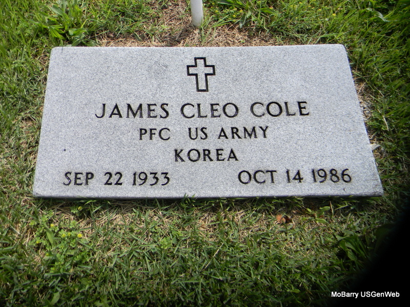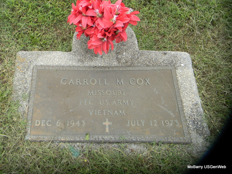 | COX, Carroll M. | Dec. 6, 1943 | July 12, 1973 | Inscription: "MISSOURI PFC US ARMY VIETNAM" - Research Note: Son of Merle C. Cox and Geraldine May Mapes. Carroll Max Cox, residence Henderson, Mills Co., IA, born Dec. 6, 1943 in Wheaton, MO, age 25, married Corliss Kaye (Archer) Pendergrass, residence Henderson, Mills Co., IA, born Oct. 14, 1947 in Logan, IA, divorced, age 21, on July 1, 1969 in Howell Co., MO. | Mother's Obit MO Marriage Records Phyllis Long Photo Bill Utter |