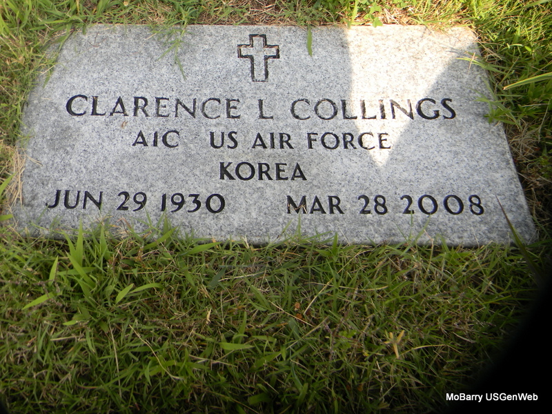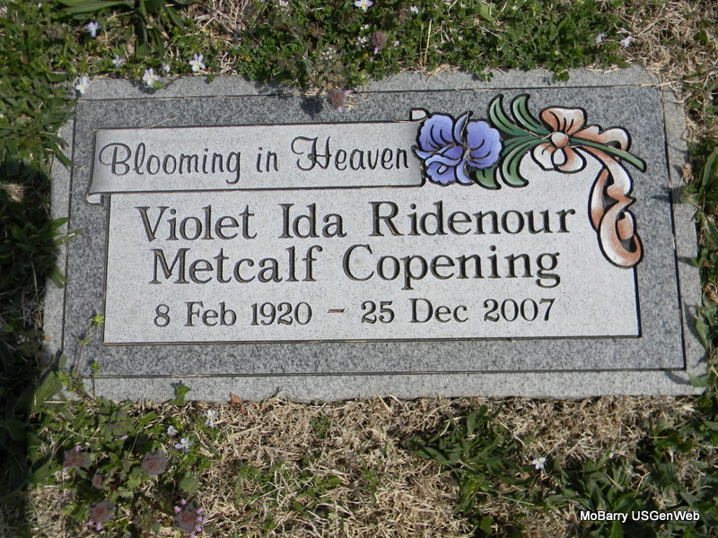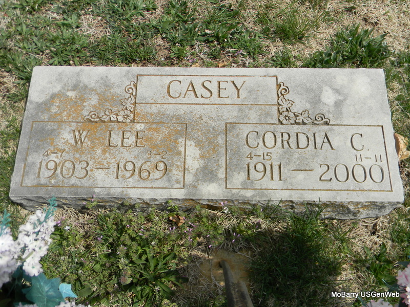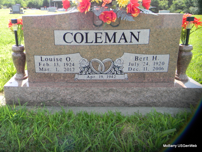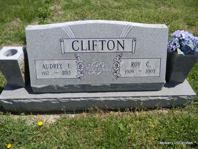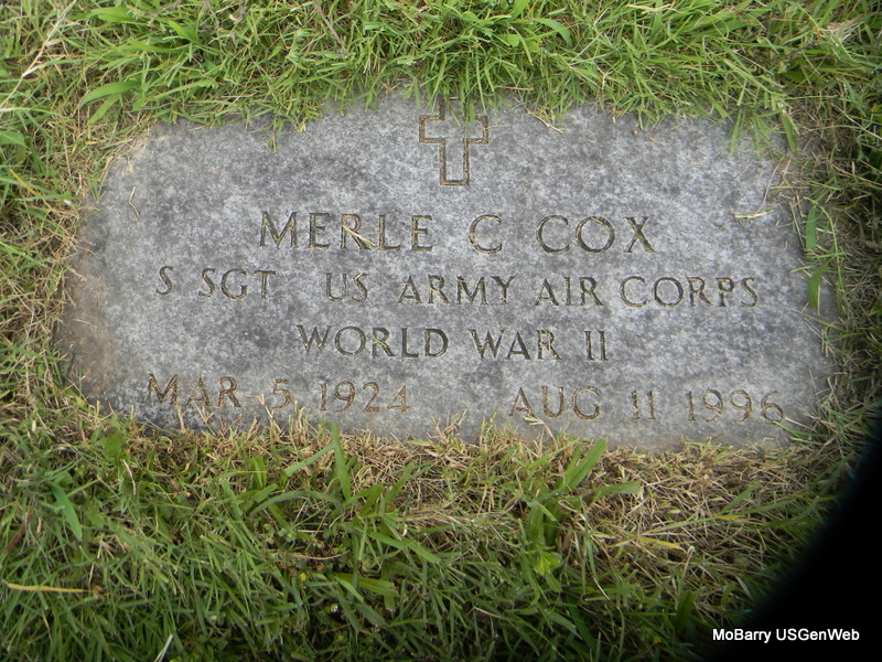| COX, Merle C. | Mar. 5, 1924 | Aug. 11, 1996 | SSW: Geraldine - Inscription: "Wed Feb. 3, 1943" - Research Note: Ernest Ellison, head, age 29, age at first marriage 24, born MO, parents born MO; Waive, wife, age 22, age at first marriage 17, born IA, father born IA, mother IL; Merle Cox, step-son, age 6, born IA, father born MO, mother IA; Billy, step-son, age 4, born NE, father born MO, mother IA; Richard, son, age 11 months, born MO, father born MO, mother IA. - Military Stone - Inscription: "S SGT US ARMY AIR CORPS WW II" | Census Phyllis Long Photos Bill Utter |