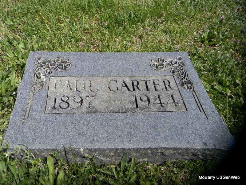 Research Note: His wife was Pruda Carter. Son of John Carter and Rose Lefler. Pruda was the informant on the death certificate. - Wheaton Journal, Feb. 28, 1957 - Funeral services for Calvin Carter of Wheaton were held at the Rocky Comfort Baptist Church Sunday afternoon, Feb. 24 by Rev. Chas. VanZandt of Cassville, assisted by Rev. Coy Holmes. Burial was made in the Rocky Comfort Cemetery under direction of the McQueen Funeral Home. Mr. Carter died at 5 o'clock Saturday morning, Feb. 23 in the Wheaton Hospital where he had been taken Thursday suffering with pneumonia. Calvin or "Dimmer", as he was called by his friends, was born May 26, 1884, near Stella, Mo. At the time of his death he was 72 years, 8 months and 27 days old. He lived his entire life in the Stella and Wheaton communities. He and his wife had resided in Wheaton for 20 years where he operated a Phillips 66 service station. He is survived by his widow, Mrs. Pruda W. Carter; a brother, Holcie Carter of Joplin, two sisters, Mrs. Maude Jessee of Stella and Mrs. Rhoda Carnes of Webb City; a number of nieces and nephews and other relatives and friends. - Carter Plot Stone - Plot Photo | Death Certificate Obit Census Phyllis Long Photo Jay Trace Photos Bill Utter |
