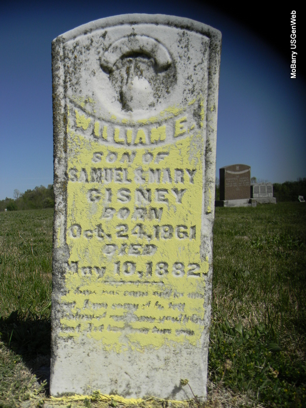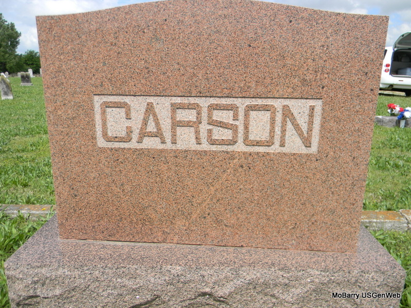 SSW: Mary J. - Research Note: Son of Daniel Carson. Mother not known on the death certificate. H. W. Carson (Son) of Fairview, MO was the informant. Census records indicate that he was the son of Judge John Evans Carson and Marinda Winnifred Fish.- Back of Stone | Death Certificate Census Phyllis Long Photos Bill Utter |