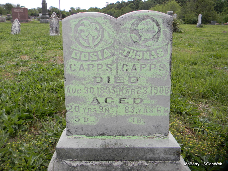 Mar. 23, 1906 | SSW: Dosia - Inscription: "Aged 83 Yrs. 6 M. 1 D." - Research Note: Listed twice. First listing is with wife as J. C. Capps. From 1860 to 1900 census, He is Thomas C. Capps. Dosia was his daughter. | Census Phyllis Long Photo Bill Utter |