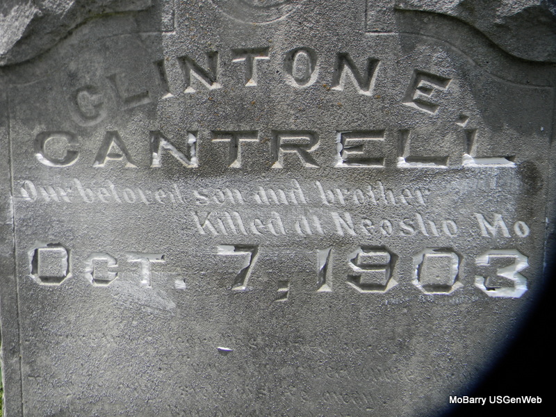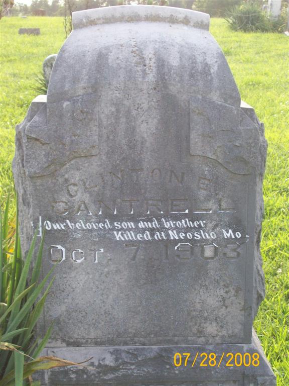 | CANTRELL, Clinton E. | Abt. 1869 | Oct. 7, 1903 | Inscription: "Our beloved son and brother - Killed at Neosho, Mo." - Research Note: 1880 Census, Franklin, Newton, Missouri - David C. Cantrell, age 51, born SC, parents born SC; Lucy L., wife, born MO; Val A., son, age 15 born MO; Clinton E., son, age 11, born MO; James V., son, age 10, born MO; Eunice, age 8, daughter, born MO; Archie B., age 4, son, born MO; Dialtha, age 3, born MO; Ora J., daughter, age 1. - 1900 Census, Clinton is single and living next door to his widowed mother. - Another Photo - Another Photo | Census Phyllis Long Photo Jay Trace Photos Bill Utter |