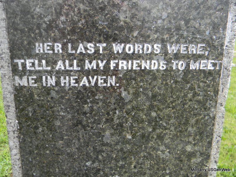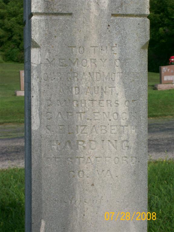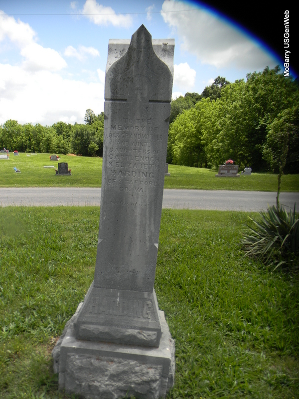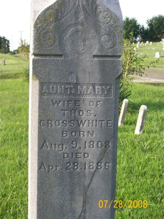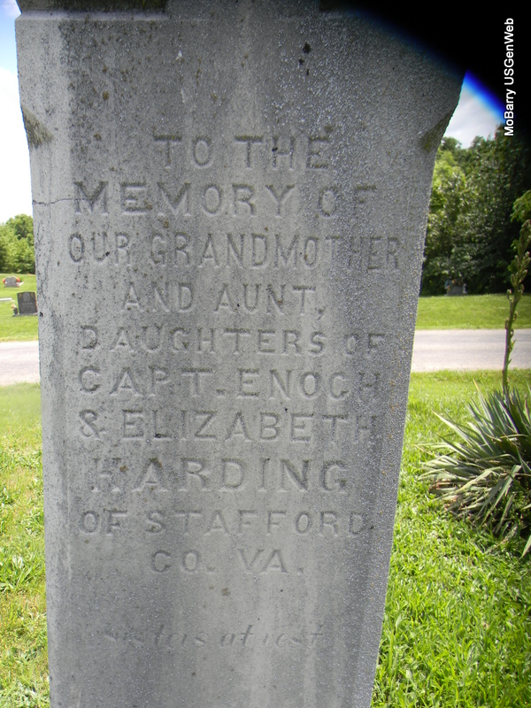 | CROSSWHITE, Mary (HARDING) | Aug. 9, 1808 | Apr. 28, 1886 | SSW: Fanny Gatewood - Inscription: "Aunt Mary - Wife of Thos. Crosswhite" - Other side: "In Memory of our grandmother and aunt. Daughters of Capt. Enoch and Elizabeth Harding of Stafford Co. Va." - Research Note: Her sisters of Frances "Fanny" U. (Harding) Gatewood. Daughter of Enoch Harding and Sarah Elizabeth Kendall. - 1850 Census, District 8, Boone, Missouri Fanny U. Gatewood, age 50, born VA; Mary Crosswhite, age 42, born VA; Thomas J. Gatewood, age 19, born VA; Festus Gatewood, age 17, born VA; Mary E. Gatewood, age 16, born VA. - Another Photo - Another Photo - Another Photo - Another Photo | Census Phyllis Long Photos Jay Trace Photos Bill Utter |