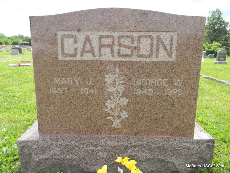 1941 | SSW: George W. - Research Note: Daughter of Elisha Estes and Elizabeth Davis. G. W. Carson married Mary J. Estes on Oct. 12, 1875 in Newton Co., MO. - Back of Stone | Census MO Marriage Records Phyllis Long Photos Bill Utter |