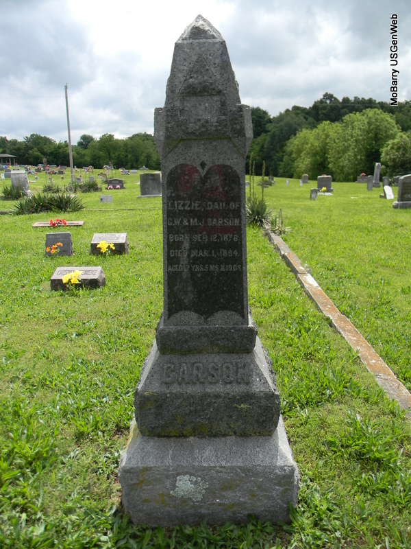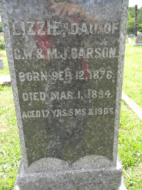| CARSON, Lizzie | Sept. 12, 1876 | Mar. 1, 1894 | Inscription: "Dau. of G. W. and M. J. - Aged 17 Yrs. 5 Ms. 19 Ds." - Research Note: Daughter of George W. Carson and Mary Jane Estes. - Another Photo - Another Photo - Another Photo | Census Phyllis Long Photos Bill Utter |