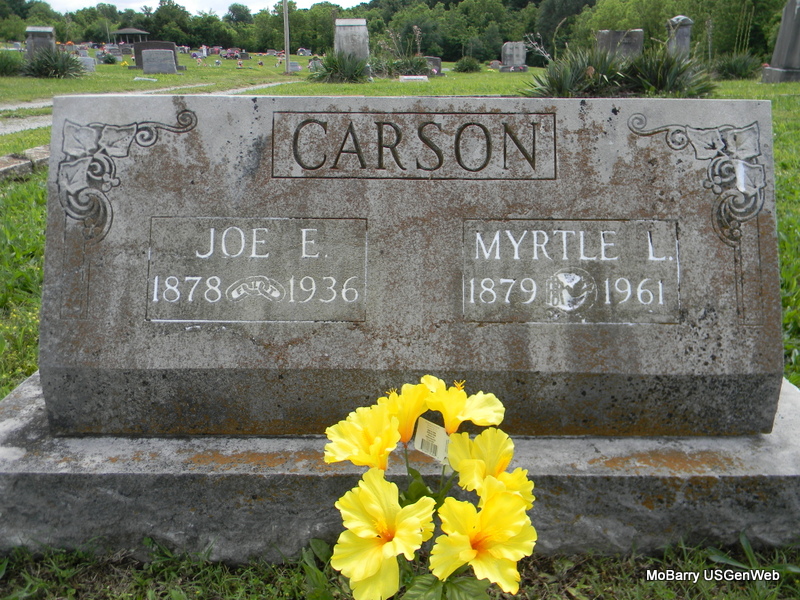 SSW: Myrtle L. - Research Note: The death certificate gives his wife as Lizzie M. Carson. Son of George Carson born KY and Mollie Estes born KY. Mrs. J. E. Carson of Rocky Comfort, MO was the informant. | Death Certificate Phyllis Long Photo Bill Utter |