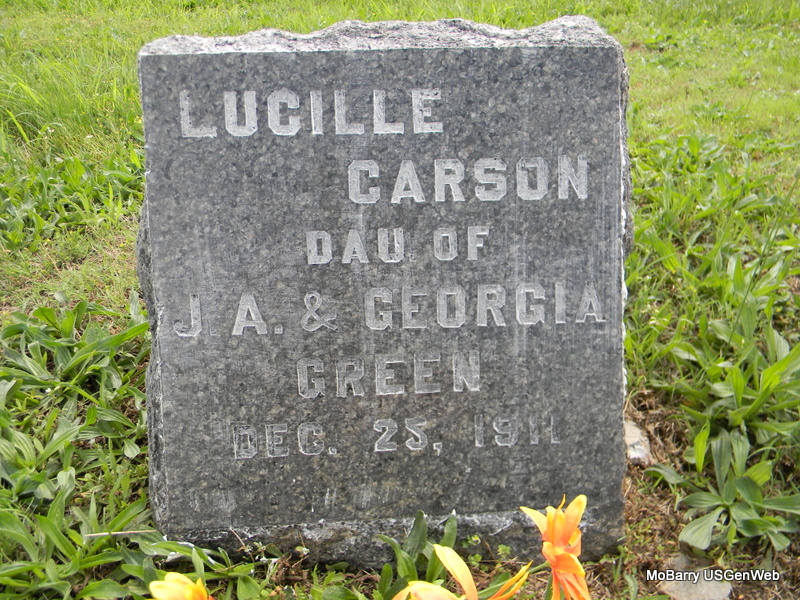 | CARSON, Lucille (GREEN) | No Date | Dec. 25, 1911 | Inscription: "Dau. of J. A. and Georgia Green" - Research Note: Only one date on the stone. Could be birth or death date. | Note Phyllis Long Photo Bill Utter |
