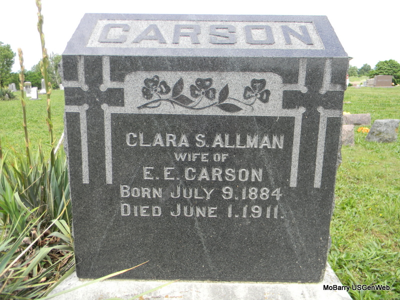 Inscription: "Wife of E. E. Carson" - Research Note: First wife of Earl Elisha Carson. Daughter of Robert James Allman born OH and Elizabeth Josephine Autry born Springfield, MO. Henry W. Carson of Fairview, MO was the informant on the death certificate. TB was the cause of death. Earl E. Carson married Clara S. Allman on Nov. 25, 1902 in Newton Co., MO. | Death Certificate MO Marriage Records Phyllis Long Photo Bill Utter |