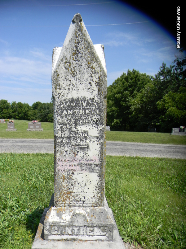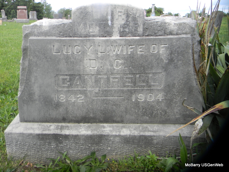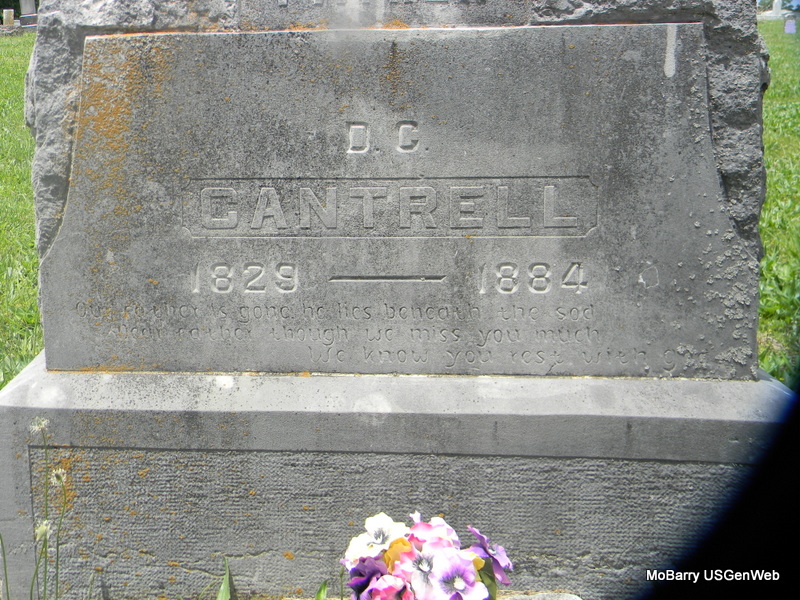 Mar. 28, 1884 | Research Note: His wife was Lucy. - 1880 Census, Franklin, Newton, Missouri - David C. Cantrell, age 51, born SC, parents born SC; Lucy L., wife, born MO; Val A., son, age 15 born MO; Clinton E., son, age 11, born MO; James V., son, age 10, born MO; Eunice, age 8, daughter, born MO; Archie B., age 4, son, born MO; Dialtha, age 3, born MO; Ora J., daughter, age 1. | Note Census Phyllis Long Photo Bill Utter |