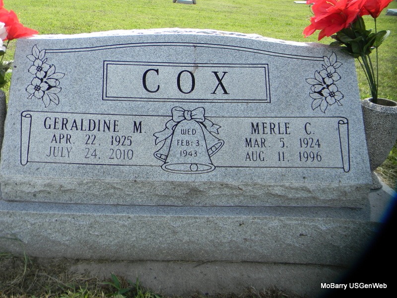 SSW: Merle C. - Inscription: "Wed Feb. 3, 1943" - Research Note: She was a daughter of George Byron and Rosa Fern (Donnelly) Mapes. On February 3, 1943, in Fairview, Missouri, she was united in marriage to Merle C. Cox, who preceded her in death on August 10, 1996. Also preceding her in death were her parents; two sons, Carroll and Gary Cox; three brothers, Richard, Charles and Vernon Mapes and a grandson, Troy Michael Wells. Geraldine grew up and received her education in Iowa. In 1969, she moved from Iowa to Missouri to make her home. | Fohn Funeral Home, Online Obit Phyllis Long Photo Bill Utter |