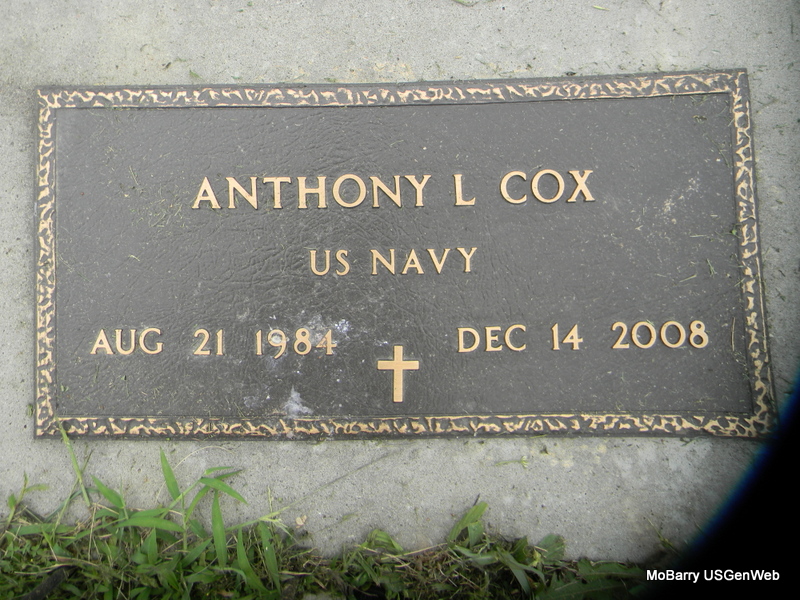 Research Note: Son of Jerry and Marilyn (Ray) Cox. Died in a car accident. Received his education in Wheaton where he was a 2003 graduate. He joined the United States Navy in 2003 and served his country honorably. He was a farmer, an employee of Wal-Mart in Cassville, and worked at SOS Poultry Supply in Wheaton. He was a member of Comfort Lodge 533 in Wheaton. - Military Stone - Inscription: "US NAVY" | Barry Co. Advertiser Dec. 17, 2008 Phyllis Long Photos Bill Utter |