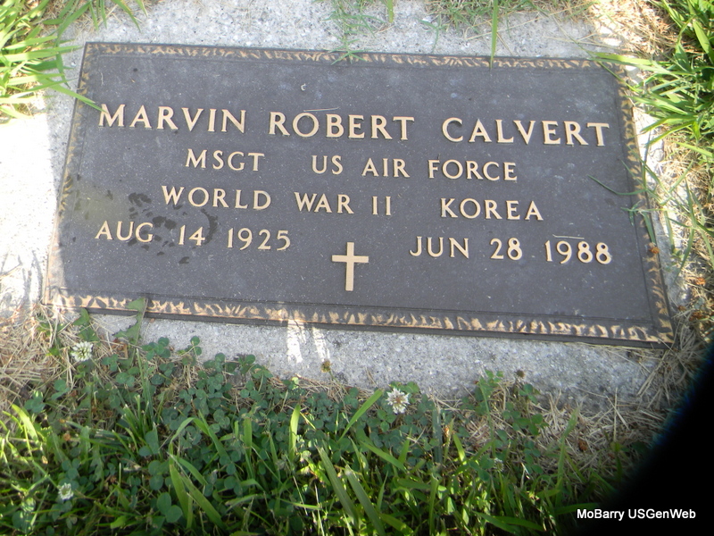 SSW: Shirley J. - Inscription: "Married Oct. 16, 1968" - Research Note: Mr. Calvert was born Aug. 14, 1925, in Victor, Iowa. He was retired from the U.S. Air Force, was a farmer and a member of an Iowa Lutheran Church. He married Shirley Clifton, Oct. 16, 1968. Survivors include a son, two daughters, three brothers, four sisters, and a grandchild. - Son of Robert Henry Calvert and Amelia Anna Niestedt. - Military Stone - Inscription: "MSGT US AIR FORCE WW II KOREA" | Neosho Daily News IA Birth Index Phyllis Long Photos Bill Utter |