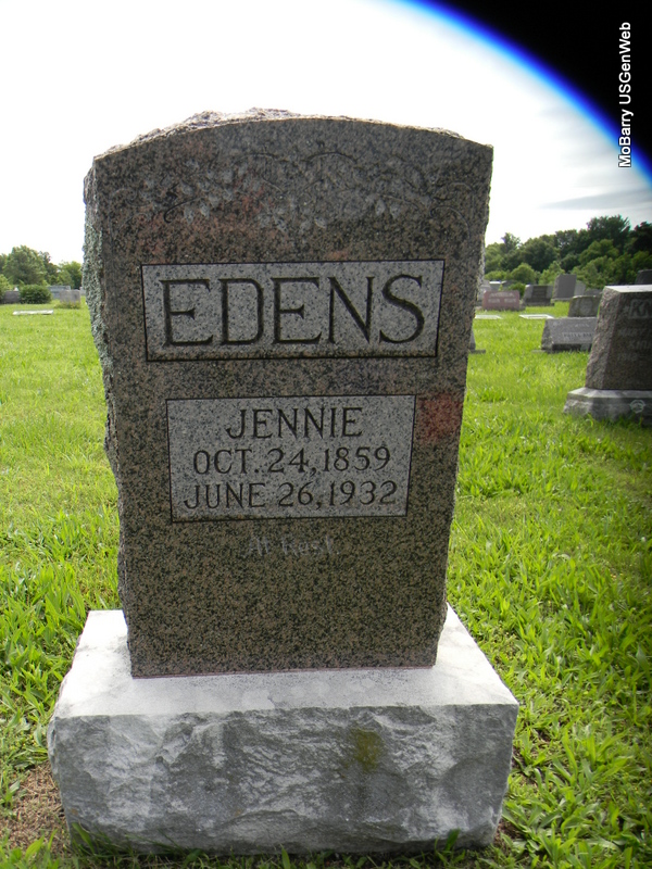 Research Note: Information taken from Memorial Records from Effie Pauline Henry files posted by James Fullerton: Jennie (Senter) (McGlothlin) Edens' Birth Place was Tennessee and she passed away at Tulsa, OK on June 23, 1932 when she was 73 years, 7 months and 30 days. (Note: Her tombstone shows her death on June 26, 1932 but it is believed that was the day she was buried). Officiating Clergyman was Rev. James M. Gold. Song Selections was: "Safe in the Arms of Jesus"; "Beautiful Isle of Somewhere"; "Never Grow Old"; rendered by the Choir. Mrs. Wally Carter was the Pianist. Pall Bearers were: Charley Edmundson, Noah Cullers, Cecil Cullers, Everett Baker, Ed Chappell, and Fern Edens. Services was held at Stella, MO with Interment at Rocky Comfort, MO. Floral Offerings: Relatives, Home Folks, Employees of the Philcade Building, Employees of the Tulsa Laundry, "Crystal White" Employees. 1870 census shows Jennie living in District 7 Gibson, Co, TN with her family; 1920 census shows Jennie living in Hickory Township, Nowata Co., OK married to William Edens; 1930 census shows Jennie living in Tulsa, Tulsa Co., OK living with a granddaughter, Effie Pauline Schell. She first married James McGlothlin and second William Edens. | Note Census Phyllis Long Photo Bill Utter |