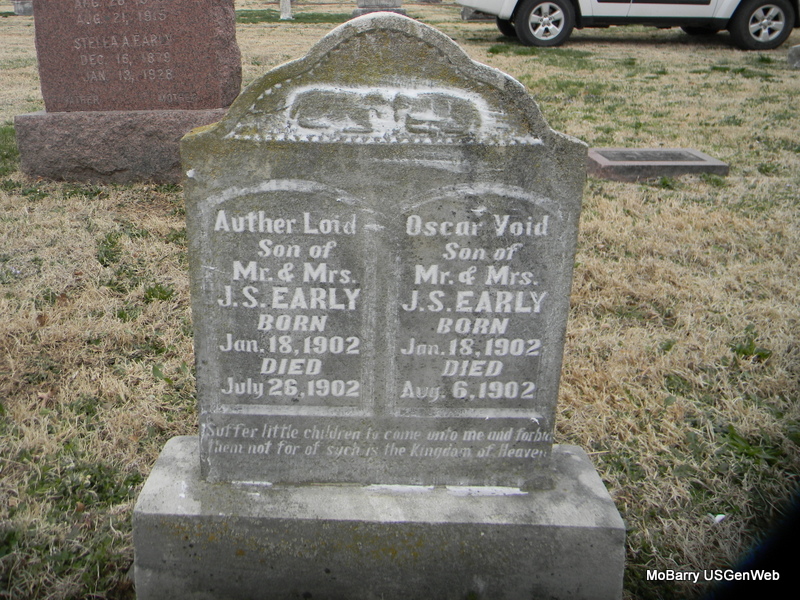 | EARLY, Oscar Void | Jan. 18, 1902 | Aug. 6, 1902 | SSW: Auther Loid - Inscription: "Son of Mr. and Mrs. J. S. Early" - Research Note: Son of John Samuel Early and Stella Davidson. Twin to Auther Loid. - Another Photo | Note Phyllis Long Photos Bill Utter |