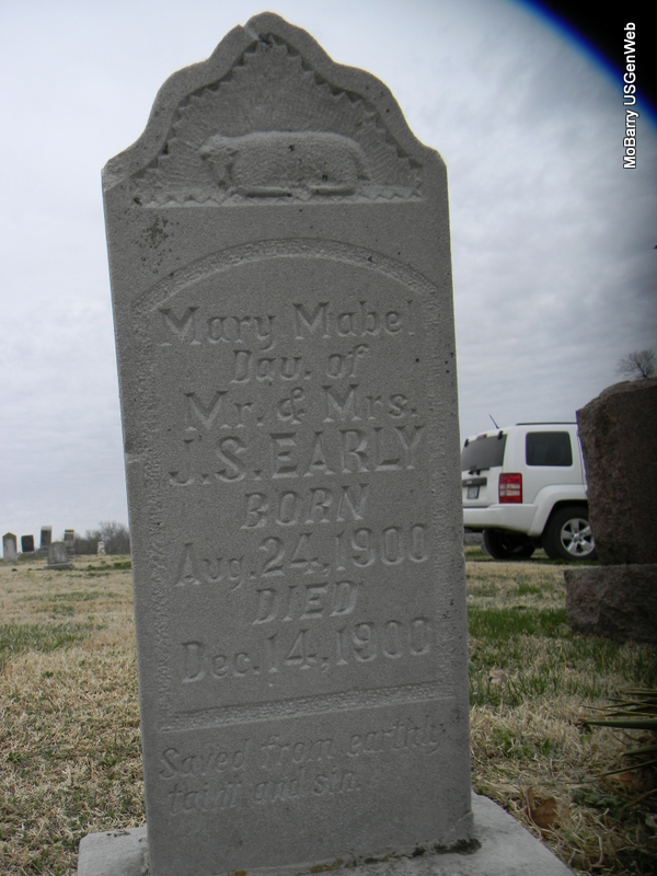 | EARLY, Mary Mabel | Aug. 24, 1900 | Dec. 14, 1900 | Inscription: "Dau. of Mr. and Mrs. J. S. Early" - Research Note: Daughter of John Samuel Early and Stella Davidson. | Note Phyllis Long Photo Bill Utter |