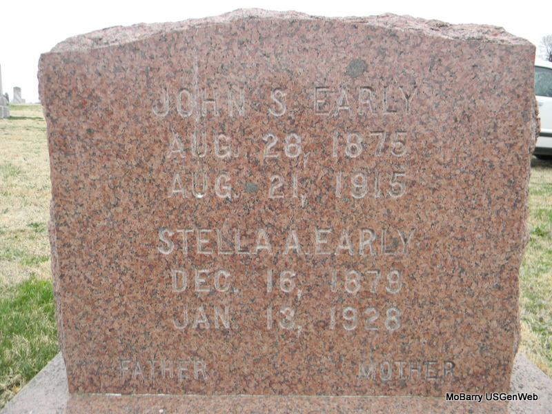 SSW: John S. - Research Note: Daughter of John Davidson born TN and Mary Ann Harrell born MO. Oren Davidson of Springfield, MO was the informant on the death certificate. J. S. Early married Stella Davidson on Dec. 19, 1897 in McDonald Co., MO. - Back of Stone | MO Marriage Records Death Certificate Phyllis Long Photos Bill Utter |