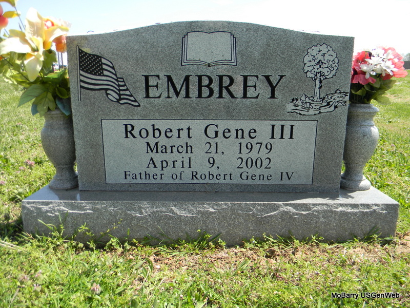 Apr. 9, 2002 | Inscription: "Father of Robert Gene IV" - Research Note: Robert Gene Embrey III, 23, of Rocky Comfort, died at 8:35 p.m. April 9 from injuries sustained in a plane crash in which he was a passenger. He had been a postal worker for the Washburn Post Office for the past three years. He was a 1997 graduate of Southwest of Washburn High School and attended Crowder College at Neosho for two years. Son of Robert Gene Embrey Jr. and Laura (Spragins) (Embrey) Larson. - Back of Stone | Obit Phyllis Long Photos Bill Utter |