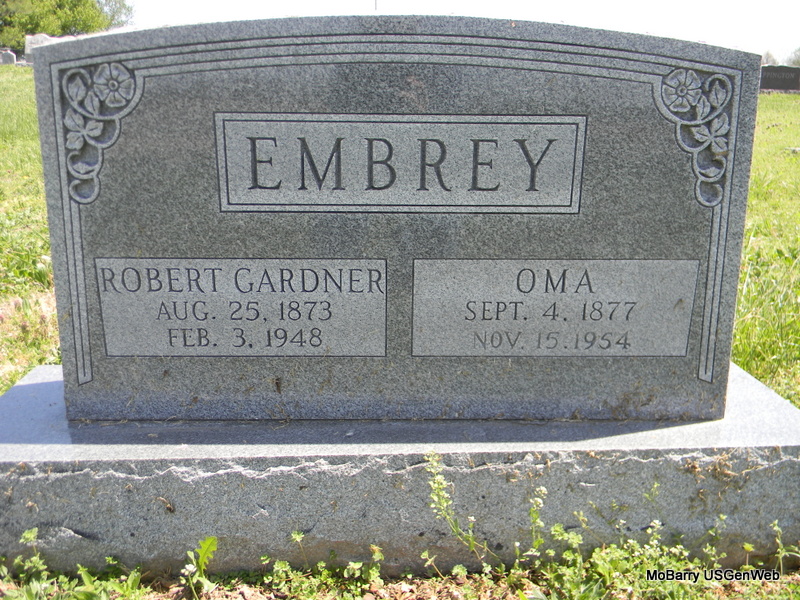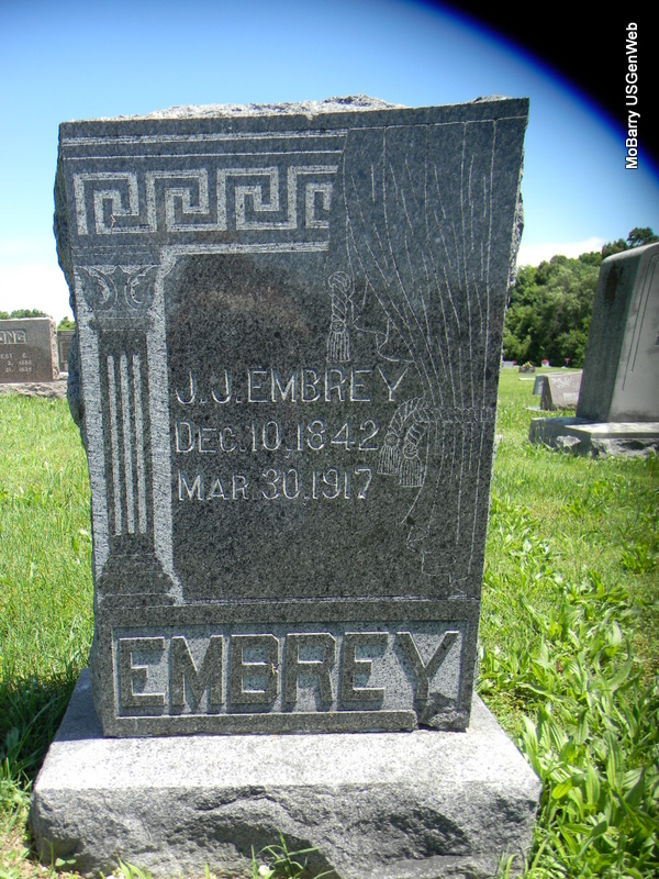 Research Note: He was widowed and a retired farmer. Son of Jackson Embrey and Amelia Blythe, both born TN. R. G. Embrey of Neosho, MO was the informant death certificate. He first married Frances Moore, may have been Frances Elizabeth Moore. Son Robert Gardner's death certificate gives his mother's maiden name as Moore. - J. J. Embrey second married Mrs. Martha Jane (Marshall) Reamsour. | Death Certificate MO Marriage Records Census Phyllis Long Photo Bill Utter |