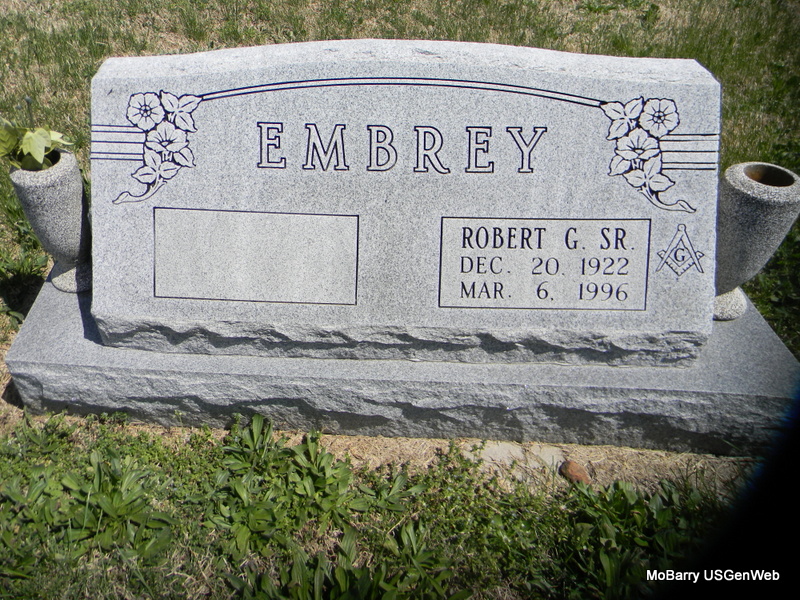 | EMBREY, Robert Gene, Sr. | Dec. 20, 1922 | Mar. 6, 1996 | Research Note: This is a double stone but the other side is blank. Robert Gene Embrey, age 31, married Beverly Anne Trevino, age 25, on Oct. 28, 1954 in Newton Co., MO. Son of William Virgil Embrey and Hazel Bell Cornell. | Wheaton Funeral Home MO Marriage Records Census Phyllis Long Photo Bill Utter |