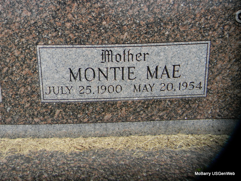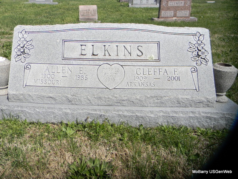 SSW: Cleffa F. - Inscription: "Married Aug. 7, 1955" - Research Note: The next entry is also for Allen E. and SSW Montie Mae his first wife. Probably buried with Cleffa. - Neosho Daily News - Services for Allen Eldridge "Dyke" Elkins, age 85, Carlsbad, NM, a former Wheaton resident who died Aug. 31, in Carlsbad, were held Wed. at Denton Mortuary, Carlsbad. Burial was in Carlsbad Cemetery (must be incorrect). Mr. Elkins was born Sept. 19, 1900 in McDonald Co., MO. Son of Lewis Riley and Oma A. Elkins. He was a retired farmer and businessman. He had lived in Wheaton many years before moving to Carlsbad 15 years ago. He was a member of the Church of Christ in Carlsbad and had been an elder at the Church of Christ in Wheaton for many years. He married Montie Mae Brown on May 6, 1922, in McDonald Co. She died May 20, 1954. He married Cleffa Frances Rogers on Aug. 7, 1955 at Jonesboro, AR. Other survivors are a son Quannah Elkins; two daughters, Lane of Rogersville, and Mary of Bellevue, WA; four grandchildren; 10 great grandchildren and 2 great great grandchildren. - Back of Stone | Obit Census Phyllis Long Photos Bill Utter |