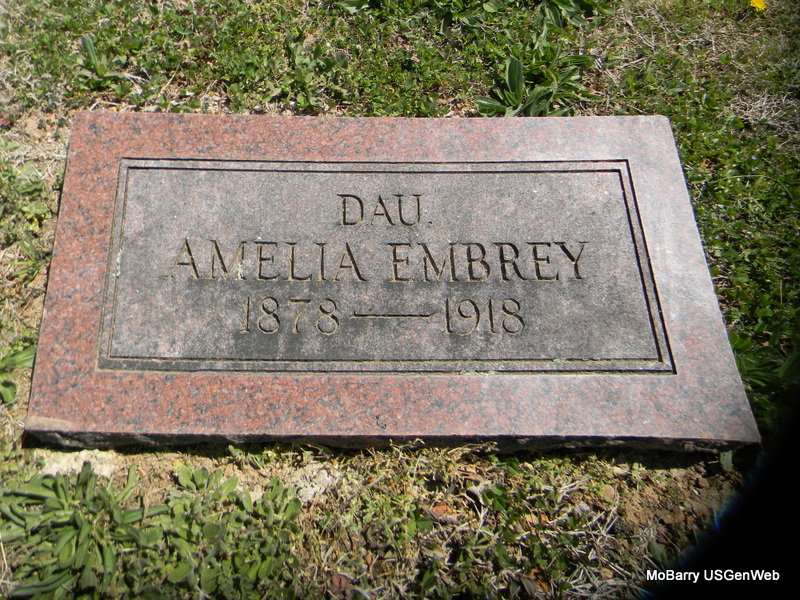 Inscription: "Dau." - Research Note: Death certificate has birth date as unknown, age 78. She was single and place of burial was Rocky Comfort. Parents not known. H. G. Embrey of Neosho, Newton Co., MO was the informant on the death certificate. - Daughter of Joseph Jackson Embrey, Sr. and Amelia Ann Blythe. The death of Miss Amelia Ann Embrey, 79, occurred Friday morning, Apr. 25, at the home of her nephew, H. G. Embrey, 433 West McCord St., with whom she made her home. Funeral services were conducted Saturday afternoon at the Baptist church in Rocky Comfort and burial made in the cemetery there. Miss Embrey, until last fall, had made her home with a niece, Mrs. Ollie Harris, in Wichita, but when the Harris family moved to Los Angeles, she came to Neosho to be with her nephew. Her health was fairly good on up until her death. Her advanced age and a sudden weakening of her heart caused her death. She is the last of her immediate family and is survived by nephews and nieces as follows: H. G. Embrey of Neosho, Robert, Roy, Clyde, and Ray Embrey of Stark City, John Embrey, living in OK, Walter, Page, and William Embrey of Rocky Comfort, Mrs. Ollie Harris of Los Angeles, Mrs. Lena Reese and Mrs. Thelma Reese of Stark City. A sister-in-law, Mrs. W. R. Embrey, with whom Miss Embrey sometimes made her home, also survives. | Death Certificate Obit Phyllis Long Photo Bill Utter |