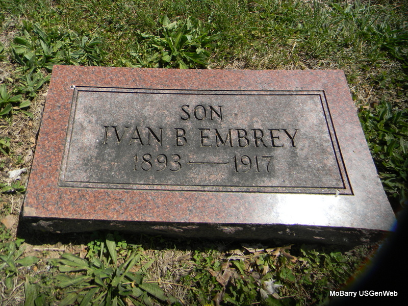 | EMBREY, Ivan B. | 1893 | 1917 | Inscription: "Son" - Research Note: Son of Seyon Blythe Embrey and Emma Kelsay. | Census Phyllis Long Photo Bill Utter |