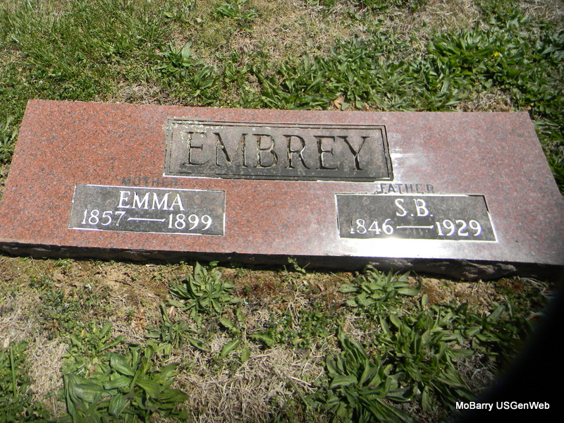 SSW: Emma - Research Note: Son of Joseph Jackson Embrey born TN and mother not known (His mother was Amelia Blythe). W. V. Embrey of rural Rocky Comfort, MO was the informant on the death certificate. - Wheaton Journal, Jan. 10, 1929 - S. B. Embrey, who for many years lived near Rocky Comfort, died at his home January 3, of flu and pneumonia. He was born July 14, 1846. Age 82 years, 5 months and 11 days. He was married to Emma Kelsay, fifty-two years ago. To this union five children were born, three of them surviving. Mr. Embrey united with the Cumberland Presbyterian Church some fifty years ago. He was a soldier in the Confederate Army during the Civil War. He was a good man and lived a consistent Christian life. Funeral services were conducted at Rocky Comfort, on Friday afternoon, January 4, by Rev. Chas. Vanzandt. Burial in the Rocky Comfort cemetery under the direction of the Pogue Funeral Service of Wheaton. | Death Certificate Online Obit Phyllis Long Photo Bill Utter |