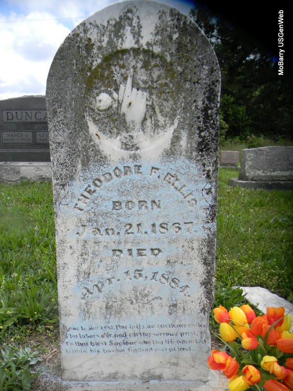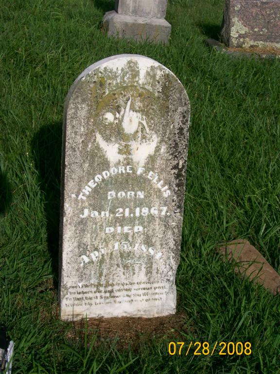 | ELLIS, Theodore F. | Jan. 21, 1867 | Apr. 15, 1884 | Research Note: Son of Rice Hughes Ellis and Elizabeth Ellen Bailey. He was the great Uncle of Janice Jones and this is what she sent to be posted: I don't know very much, didn't even know he existed until recent years as I was only 10 when my Grandmother died. We made 2 trips to the cemetery looking for his grave. I know he was the oldest of the children and was 17 when he died. I understand he died in Neosho of meningitis but they were living in Rocky at that time. The family then moved to the Twelve Corners/Jacket area and the girls were all reared on the farm there. His three sisters were sisters, Alener, Izular and Emma. His parents are buried at the Dent cemetery. - Another Photo | Census Note Phyllis Long Photos Jay Trace |