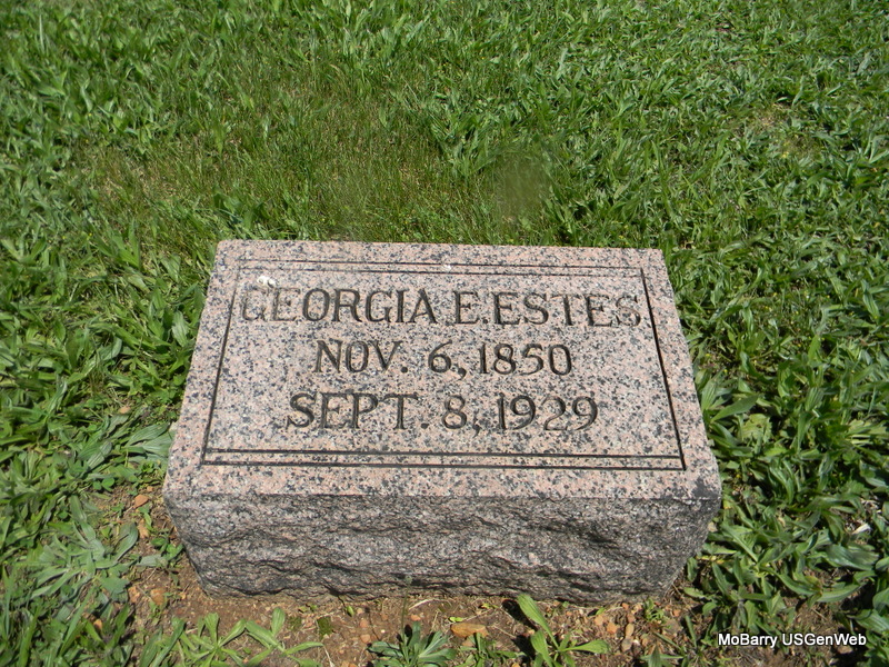 Research Note: She was widowed and the daughter of George Gallaher born Huntington, WV. Mother is listed but hard to read, maybe Naomi Simmons, born Huntington, WV. Anna G. Calbut of Warsaw, MO was the informant on the death certificate. - William Henry Estes married Georgia Gallaher on Nov. 2, 1869 in Pettis Co., MO. - Plot Stone | Death Certificate MO Marriage Records Phyllis Long Photos Bill Utter |