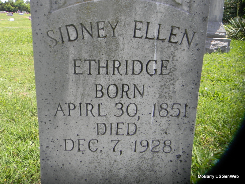 Research Note: Death certificate filed under Etheridge, spelled Ethridge on the stone. Daughter of James Raleigh and Celia Fiska, born Owen Co., IN. April spelled Apirl on the stone. - Wheaton Journal, December 20, 1928 - Sidney Ellen Ethridge was born in Owen County, Indiana, April 30, 1851 and died December 7, 1928 at the age of 77 years, 7 months and 7 days. She was married in 1871 to William Bullard. To this union were born two children, one dying in infancy. One survives, Mrs. --- E. Allman of Fairview, where she made her home. Her husband preceded her in death in 1879. In 1848 she united with the Christian Church at Bethpage, Mo. In 1883 she was married to Louis Ethridge. To this union was born one child, Mrs. A. J. Hance, of Fairview; four step-children survive her, Robert, Lonzo, Amos and Pearlie Ethridge and one step-daughter, Mrs. Spicie Bruner; eight grand children and thirteen great grand-children and a host of other relatives and friends are left to mourn her loss. She was a loving companion, mother and a friend to all. Funeral services were conducted by Rev. J. S. McQueen at Rocky Comfort, Sunday, December 9, 1928. - Another Photo - Another Photo | Online Obit Death Certificate Phyllis Long Photo Jay Trace Photos Bill Utter |