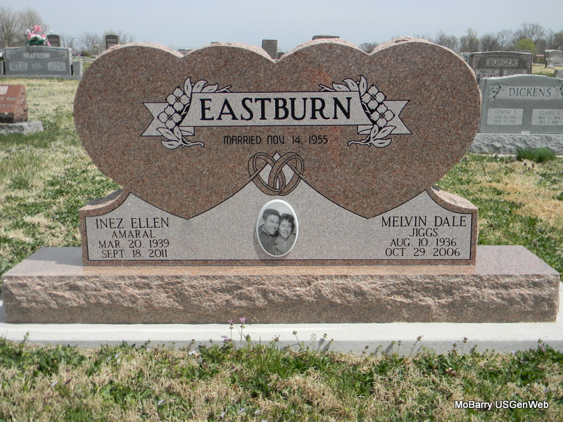 SSW: Melvin Dale - Inscription: "Married Nov. 14, 1955" - Research Note: She was the daughter of Manuel C. and Mildred (Sylvester) Amaral. She was raised in Fair Grove, Missouri, and was a 1957 graduate of Rocky Comfort High School. On November 14, 1955 she was united in marriage to Melvin Dale Eastburn and to this union two daughters and four sons were born. She was preceded in death by her parents; her husband of fifty years, Melvin Eastburn on October 29, 2006; a son, Timmy David Eastburn; a daughter, Tammy Eastburn; and two brothers, George and Joe Amaral. Melvin Eastburn of Rocky Comfort, MO married Inez Ellen Amaral of Fair Grove, MO on Dec. 2, 1955 by Rev. Hugh Higgs at his home. - Back of Stone - Photo on Stone | Higgs Marriage Records Obit Phyllis Long Photos Bill Utter |