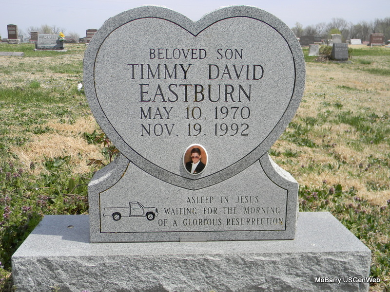 | EASTBURN, Timmy David | May 10, 1970 | Nov. 19, 1992 | Inscription: "Beloved Son" - Research Note: Buried next to Melvin and Inez Eastburn, his parents. Tim Eastburn, was shot with his own rifle by two men in the company of his ex-wife the night of Nov. 19, 1992, at his rural residence near Rocky Comfort. Though she did not pull the trigger Sheena Eastburn was sentenced to life in prison without the possibility of parole. - Photo on Stone | Note Phyllis Long Photos Bill Utter |