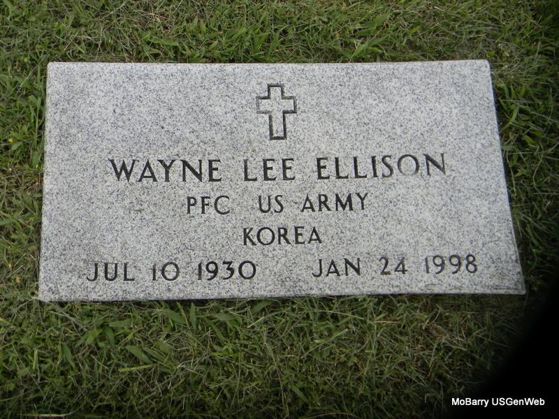 | ELLISON, Wayne Lee | July 10, 1930 | Jan. 24, 1998 | Inscription: "PFC US ARMY KOREA" - Research Note: Son of Ernie Ewing Ellison and Waive C. Farrington. | Census Phyllis Long Photo Bill Utter |