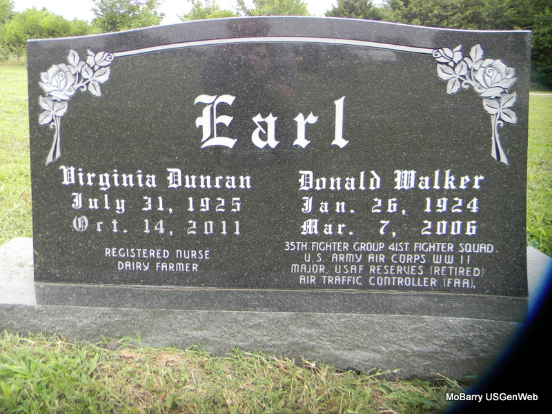 SSW: Donald Walker - Inscription: "REGISTERED NURSE, DAIRY FARMER" - Research Note: Daughter of Robert E. and Lottie Marie (Rohn) Duncan. Virginia was a Registered Nurse at the former Sale Hospital and several nursing homes in the area. She married Donald W. Earl on July 5, 1947 in Fairview, Mo. he preceded her in death on March 7, 2006. She was preceded in death by one daughter, Jo Ann Earl in 1998, three brothers, and four sisters. - Back of Stone | Mason-Woodard Funeral Home Phyllis Long Photos Bill Utter |