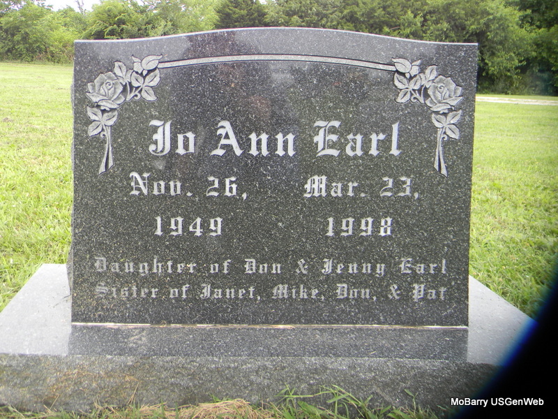 | EARL, Jo Ann | Nov. 26, 1949 | Mar. 23, 1998 | Inscription: "Daughter of Don and Jenny Earl" - Research Note: Daughter of Donald Walker Earl and Virginia Duncan. - Back of Stone - Inscription: "In Loving Memory of Jo Ann - School Librarian, Forsyth, MO, 1972 - 1998" | Note Phyllis Long Photos Bill Utter |