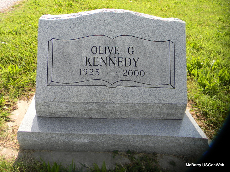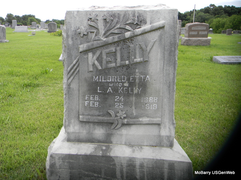 | KELLY, Mildred Etta (DAVIDSON) | Feb. 24, 1888 | Feb. 25, 1919 | Inscription: "Wife of L. A. Kelly" - Research Note: Daughter of Albert Gentry Davidson and Julia Coffee. First wife of Lee Audley Kelly, DDS, died 1975 and buried at Belfast Cemetery, Newton Co., MO. | Census Phyllis Long Photo Bill Utter |