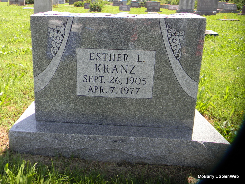 | KRANZ, Esther L. (BARNETT) | Sept. 26, 1905 | Apr. 7, 1977 | Research Note: Henry G. Kranz, age 36, married Esther L. Barnett, age 30, on Dec. 12, 1936 in Clay Co., MO. Daughter of Morris Monroe Barnett and Edna L. Lamberson. | Census MO Marriage Records Phyllis Long Photo Bill Utter |