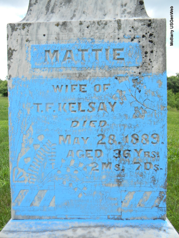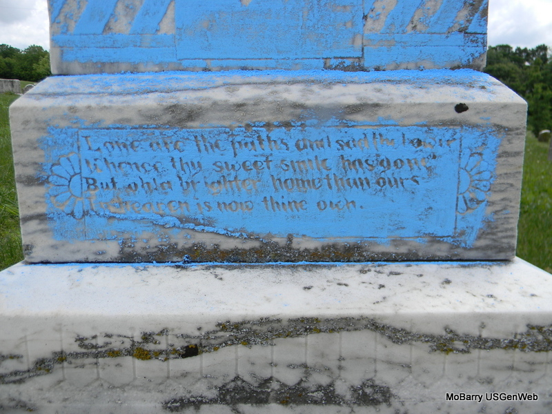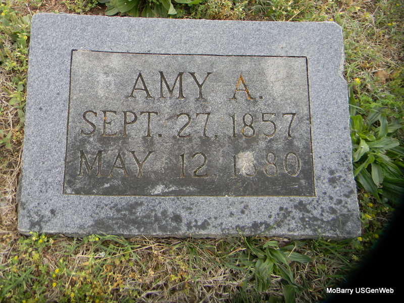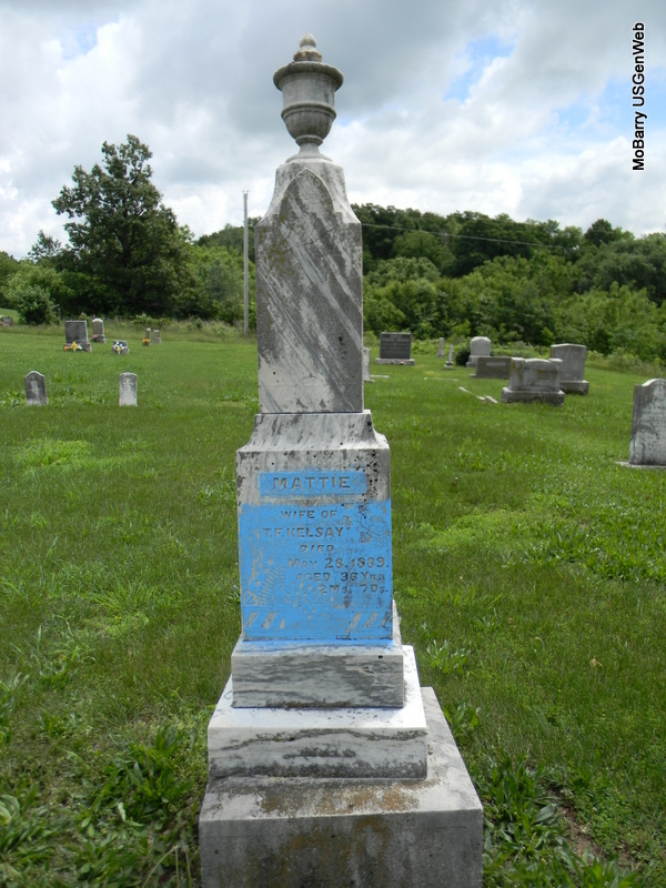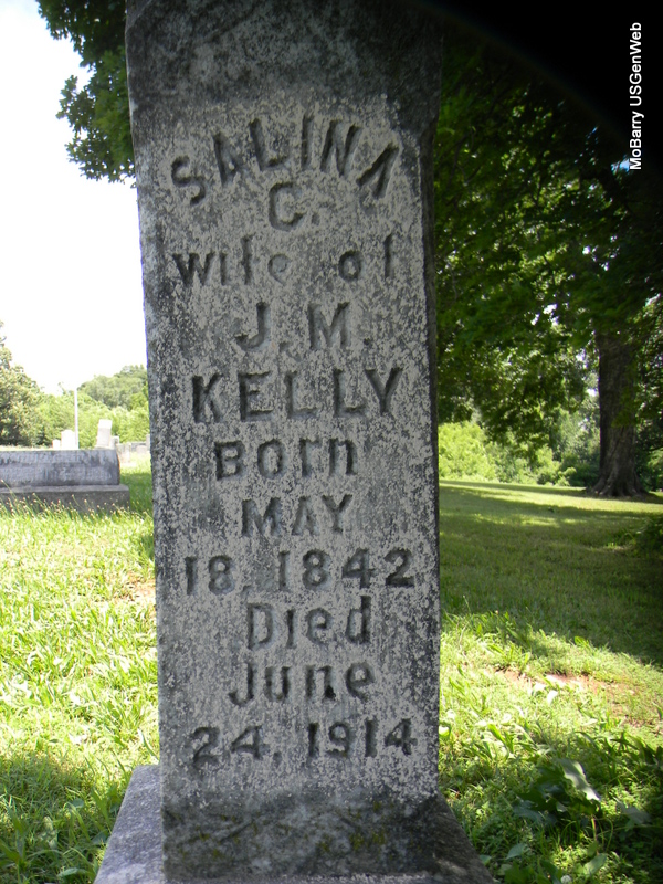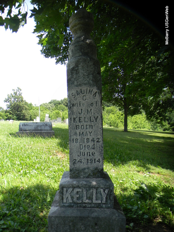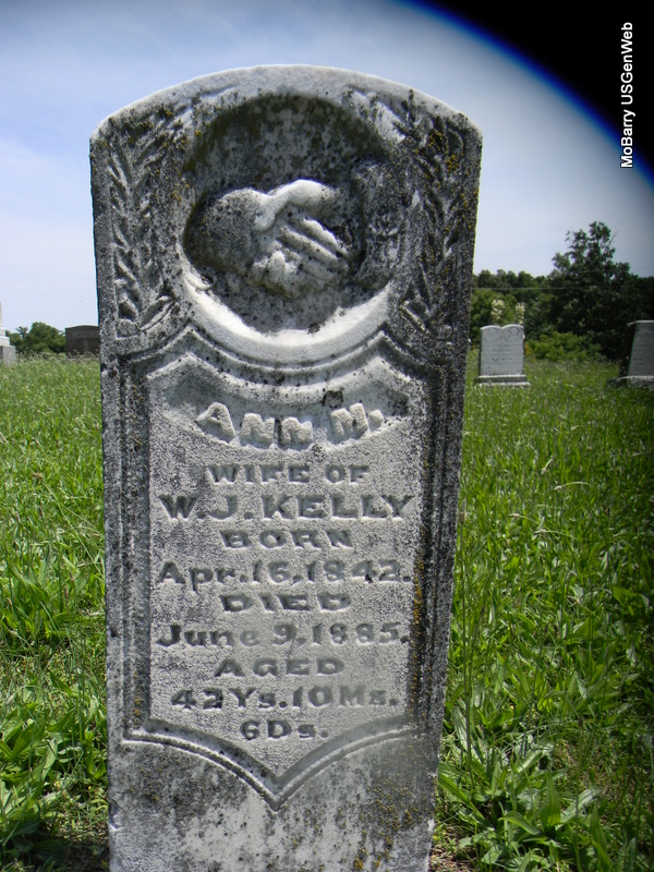 | KELLY, Ann M. | Apr. 16, 1842 | June 9, 1885 | Inscription: "Wife of W. J. Kelly" - "Aged 42 Ys. 10 Ms. 6 Ds." - Research Note: Maiden name either Deathridge or Duddridge. Wife of William Jasper Kelly. Supposed to be buried at Granby, MO. Son of James Kelly and Polly Randall. | Census Phyllis Long Photos Bill Utter |