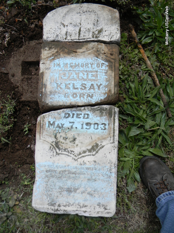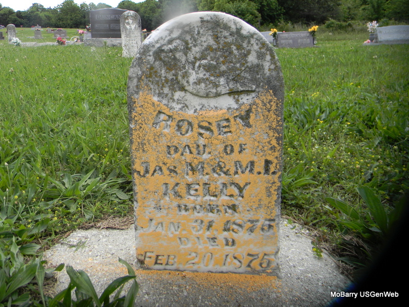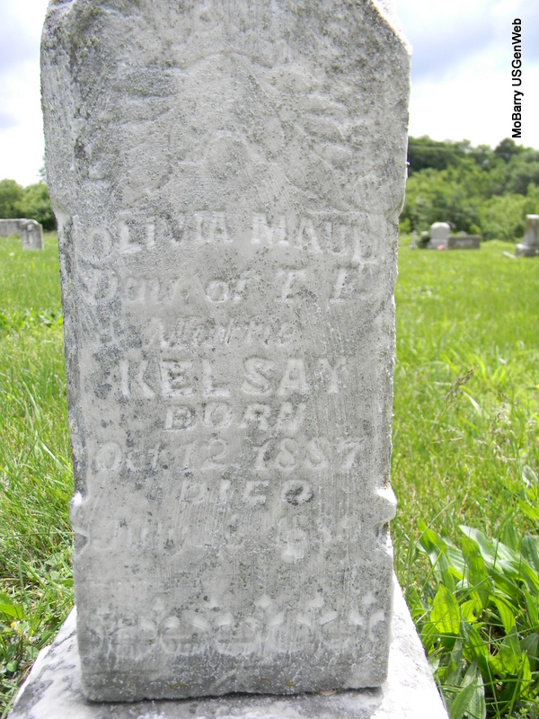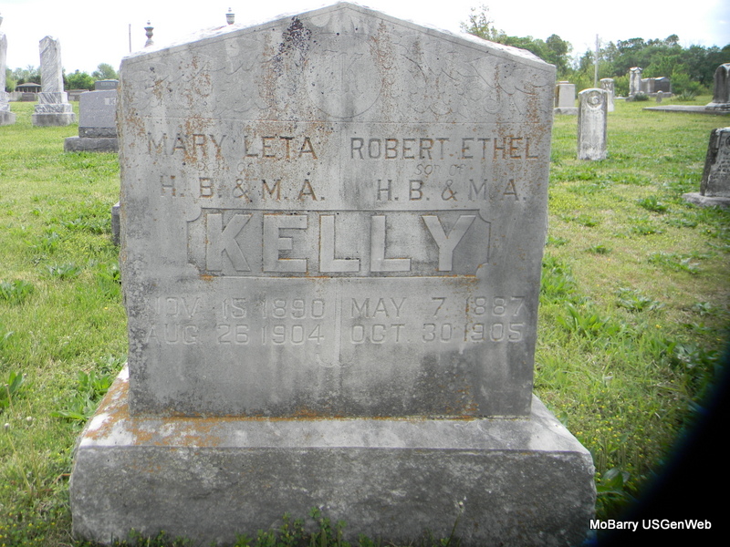 | KELLY, Mary Leta | Nov. 15, 1890 | Aug. 26, 1904 | SSW: Robert Ethel - Inscription: "Dau. of H. B. and M. A." - Research Note: Daughter of Henry Boone Kelly and Madosa Ann Scott. | Census Phyllis Long Photo Bill Utter |