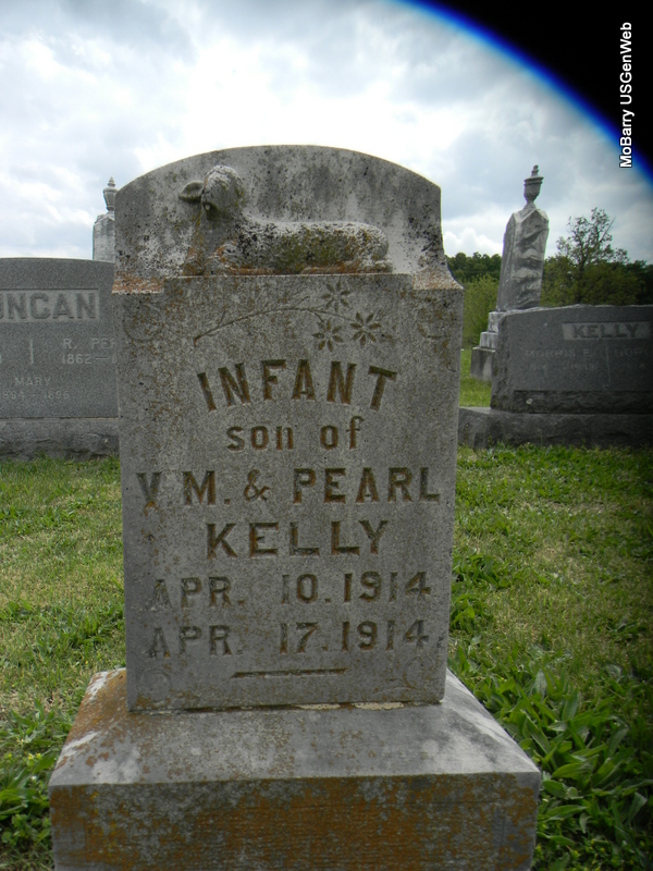 | KELLY, Infant Son | Apr. 10, 1914 | Apr. 17, 1914 | Inscription: "Infant Son of V. M. and Pearl" - Research Note: Son of Vernon M. Kelly and Pearl Duncan. | Note Phyllis Long Photo Bill Utter |