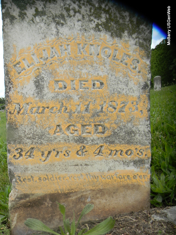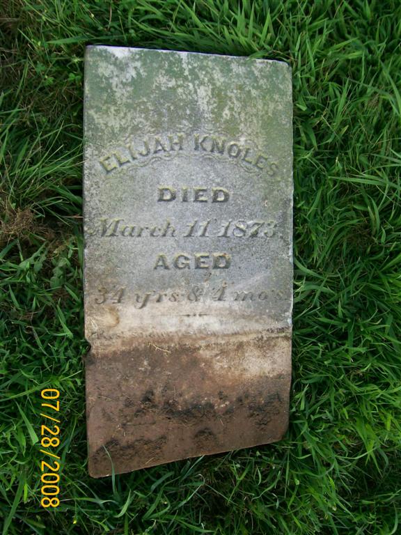 | KNOLES, Elijah | Abt. 1839 | Mar. 11, 1873 | Inscription: "34 yrs. and 4 Mos." - Research Note: This stone is broken off the base and is on the ground. - Another Photo | Photo Jay Trace Photo Bill Utter |