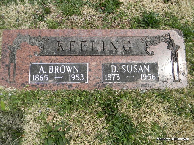 SSW: Andrew Brown - Research Note: Daughter of Alexander M. Roberts and first wife. CA death index gives her mother's maiden name as White. Susan Roberts, age 19, married Andrew B. Keeling, age 26, on Dec. 7, 1892 in Barry Co., MO. | Census MO Marriage Records Phyllis Long Photo Bill Utter |