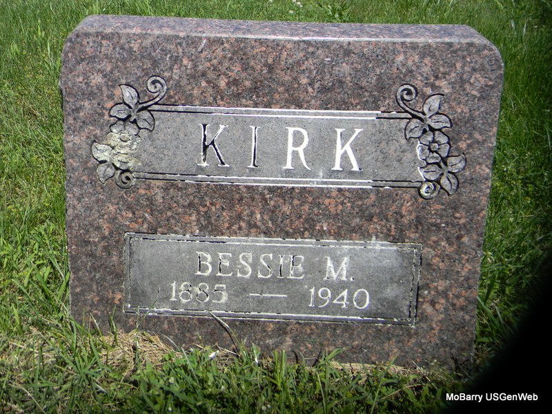 Research Note: Matches stone for Bessie M. his wife. Son of John Kirk and Elizabeth Plumlee. Carl Kirk of Wheaton, MO was the informant on the death certificate. | Death Certificate Phyllis Long Photo Bill Utter |