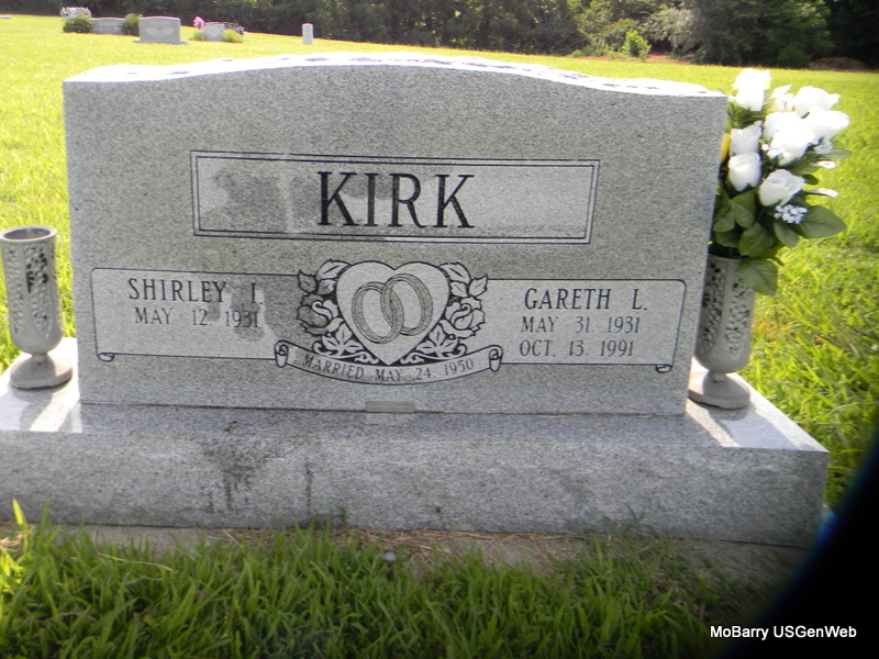 SSW: Shirley I. - Inscription: "Married May 24, 1950" - Research Note: Son of Loral Edwin Kirk and Josie E. Deal. He was a lifelong resident of Stella. He was employed by Talbot Wire for 25 years. He was a charter member of the Chapel of the Ozarks Church, Rocky Comfort. He married Shirley Dabbs on May 24, 1950, at Bentonville, AR. | Joplin Globe Phyllis Long Photo Bill Utter |