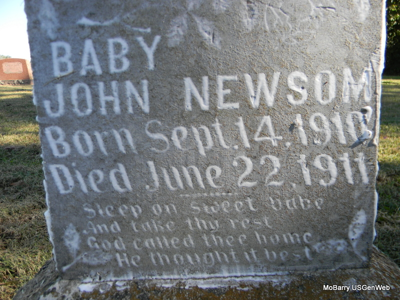 | NEWSOM, John | Sept. 14, 1910 | June 22, 1911 | Inscription: "Baby" - Research Note: Probably the son of Thomas H. and Idella Newsom. - Another Photo | Note Phyllis Long Photos Bill Utter |