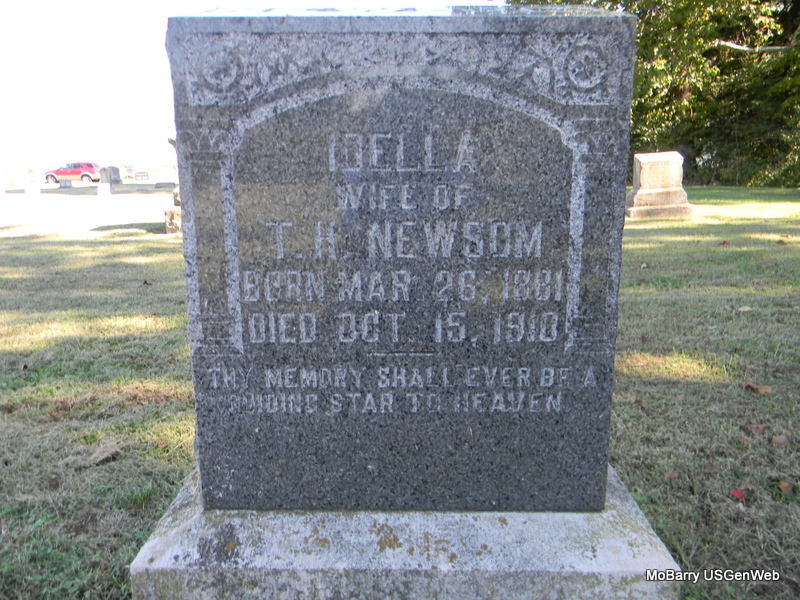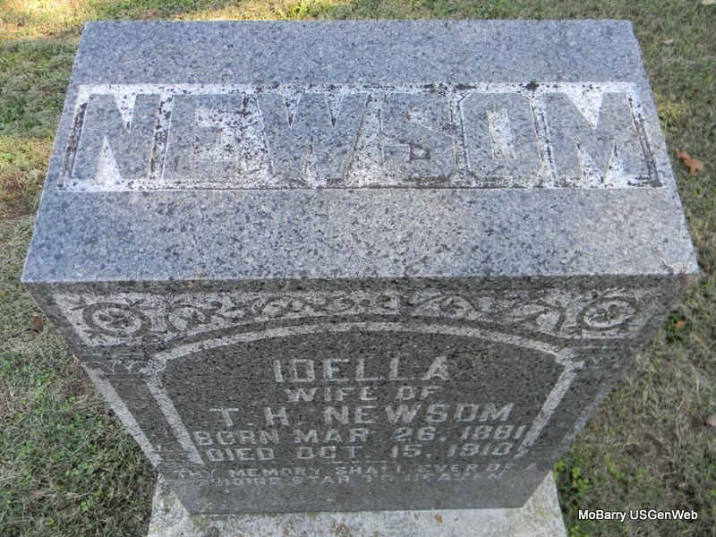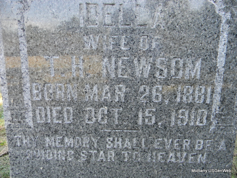 | NEWSOM, Idella | Mar. 26, 1881 | Oct. 15, 1910 | Inscription: "Wife of T. H. Newsom" - Research Note: Wife of Thomas H. Newsom. - Another Photo - Another Photo | Census Phyllis Long Photos Bill Utter |