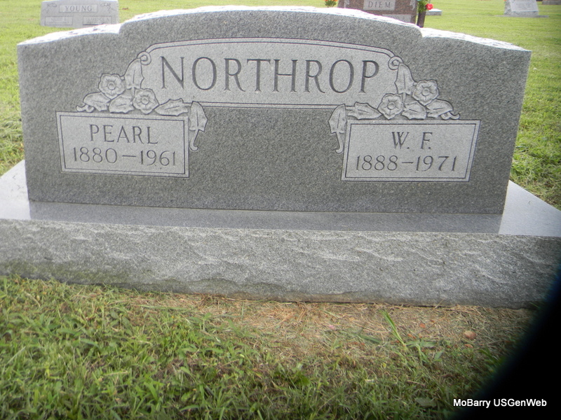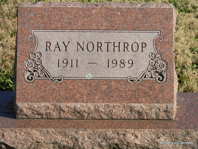 | NORTHROP, Ray | 1911 | 1989 | Research Note: Matches the stone for Lela A. Northrop. Full name was Henry Ray Northrop. Son of William Franklin Northrop and Pearl Constance Flaxbeard. He first married Eleanor Louise Jennings. Second wife was Lela Lou (Long) Young. | MO Marriage Records Census Phyllis Long Photo Bill Utter |