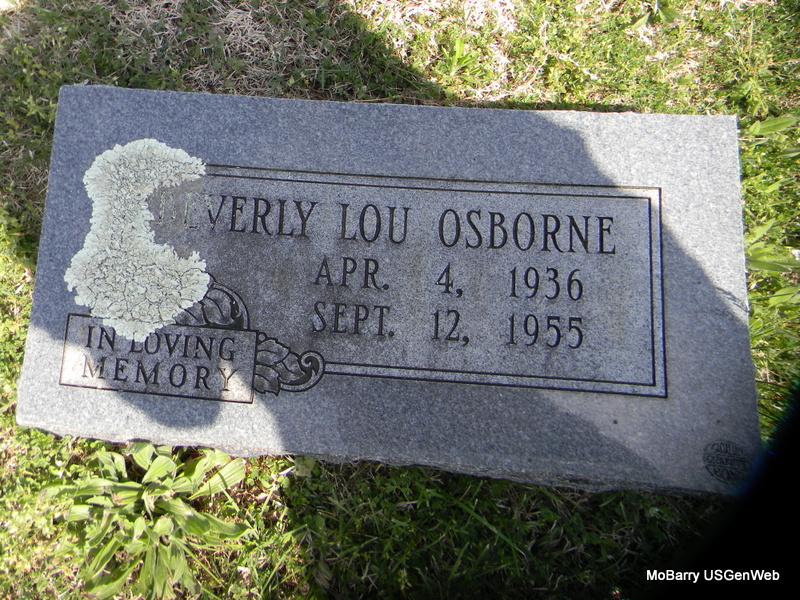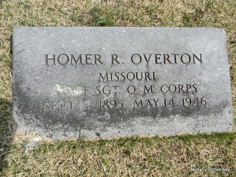 | OVERTON, Homer R. | Sept. 12, 1895 | May 14, 1946 | Inscription: "MISSOURI STAFF SGT. Q. M. CORPS" - Research Note: Son of Robert C. Overton and Eliza Swindle. - Cassville Republican, February 27, 1913 - Circuit Court Docket - State vs. W. C. May and Homer Overton, gambling. - March 27, 1913, State vs. W. C. May and Homer Overton, gambling, plead guilty, paroled. - June 9, 1917, Saturday, Cassville Democrat - Local And Personal: Homer Overton, son of Mr. and Mrs. Robert C. Overton, was telegraphed last week to report for service in U. S. Army at St. Louis, at earliest convenience. Homer left for St. Louis, May 28, and it is hoped that he may return to his home when these critical times are over and peace and happiness rule the world. - Cassville Republican, July 31, 1919 - Homer Overton of Wheaton came to Cassville Thursday and drove home in a new Dodge car which he bought of Houston and Reed the local distributors of the Dodge. Homer was in France during the world war and says that he Dodge car was thoroughly tested there and found to be a high class car. - July 31, 1920, Cassville Democrat, Barry Co., MO - WHEATON - Homer Overton is at home from California. | Mother's Obit Online Newspapers Phyllis Long Photo Bill Utter |
