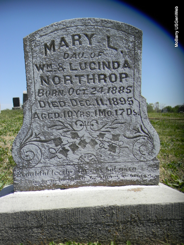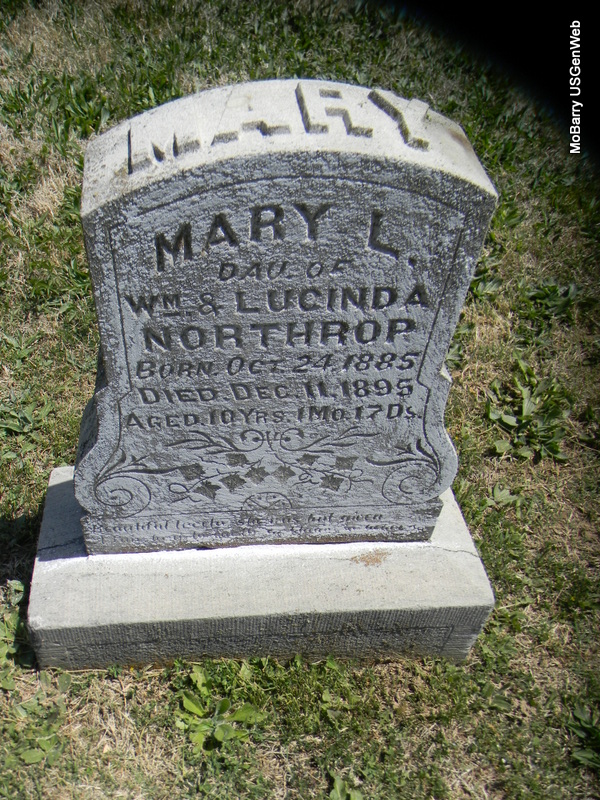 | NORTHROP, Mary Lucinda | Oct. 24, 1885 | Dec. 11, 1895 | Inscription: "Dau. of William and Lucinda" "Aged 10Yrs 1MO 17Ds" - Research Note: Daughter of William Northrop and Lucinda Elizabeth Hubbard. - Another Photo | Note Phyllis Long Photos Bill Utter |